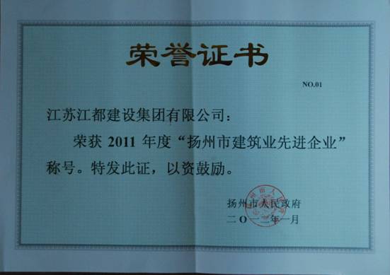 在元月29日(正月初七)召开的全市建筑业工作会议上,集团被扬州市人民政府隆重表彰为2011年度扬州市建筑业先进企业。近年来,集团始终保持良好的发展势头,不断谋求跨越发展的新思路,品牌建设、管理水平、企业文化等方面取得了显著的成绩,经济效益和社会效益得到不断攀升。