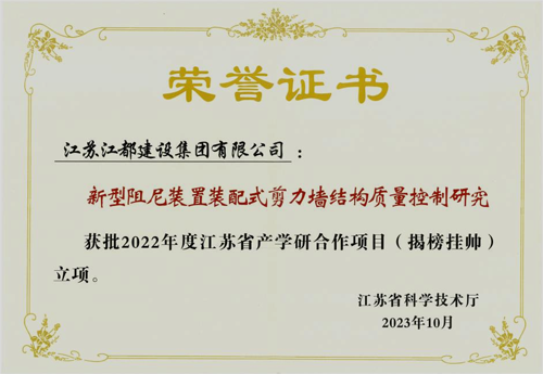 10月25日,在扬州市会议中心召开了第八届中国创新挑战赛(扬州)。会上对省市级揭榜挂帅项目颁发了立项证书,我公司发榜的《新型阻尼装置装配式剪力墙结构质量控制研究》被江苏省科技厅批准2022年度江苏省产学研合作项目(揭榜挂帅)立项。