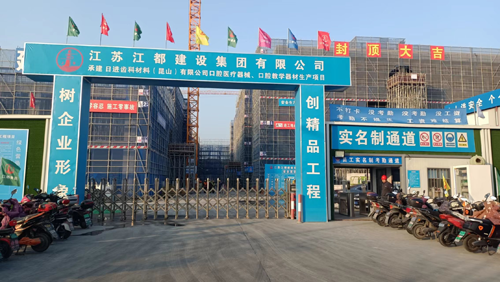 该项目是由日进齿科材料(昆山)有限公司投资建设,工程总建筑面积27177平方米,主体结构为4层混凝土框架结构,包括办公楼、生产厂房1、生产厂房2、生产厂房3、门卫等。该项目在项目部所有人员的共同努力之下,克服重重困难,科学部署、精心谋划,确保安全、质量、进度稳步推进,顺利封顶。后期,项目部将按照保安全、保质量、保进度、保稳定的四保原则继续加强对现场的管理,确保圆满完成日进齿科口腔医疗器械、口腔教学器材生产项目的建设任务。