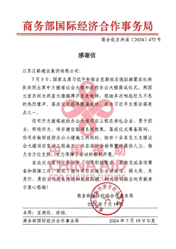 商务部国际经济合作事务局在感谢信中表示,落成仪式筹备期间,集团公司在做好政府办公大楼施工的同时,组织十余名瓦工支援议会大楼项目室外工程施工,并在活动会场布置时提供人力、物力全方位支持,有力保障了活动的顺利开展,展现了援外项目实施企业讲政治、顾大局、负责任、勇担当的优良传统和良好风貌。